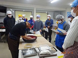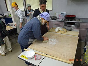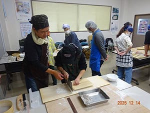 2025年度 第5回余暇活動の様子 余暇活動講師には『そばりえの会』の方お願いし、『出雲ライオンズクラブ』にも協賛いただき、日本三大蕎麦の一つである『出雲そば』を自分たちで打って食べましょうと企画したところ、14名の参加者がありました。